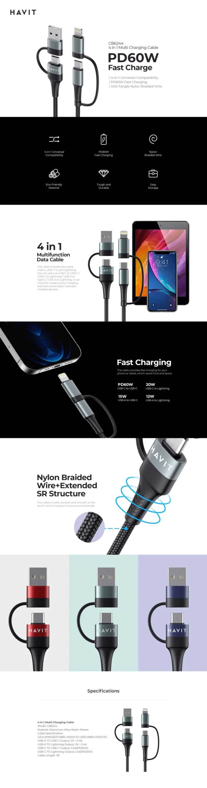 HAVIT Charging Cable CB6244 USB Type-C / Lightning / USB-A