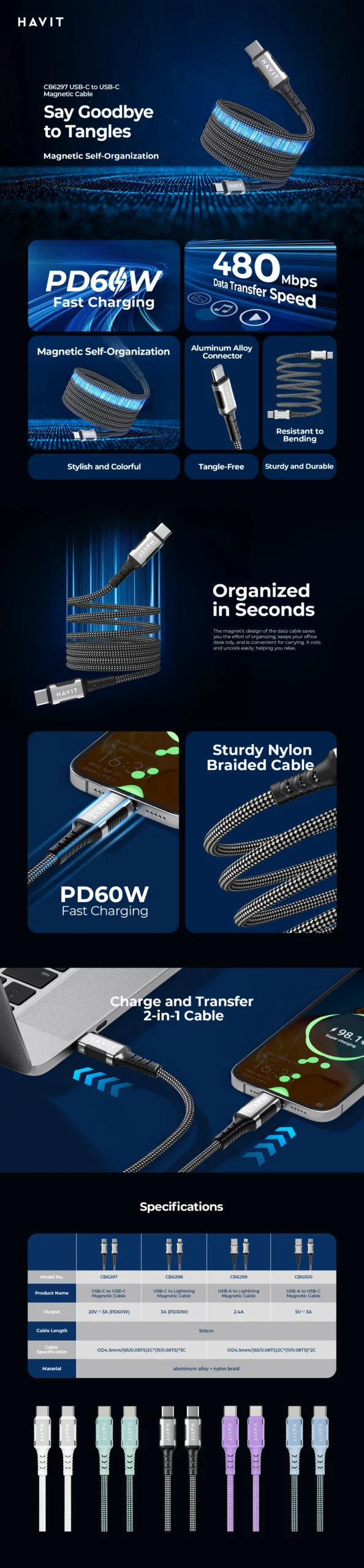 HAVIT Charging Cable Type-C / Lightning / USB – Magnetic – Black